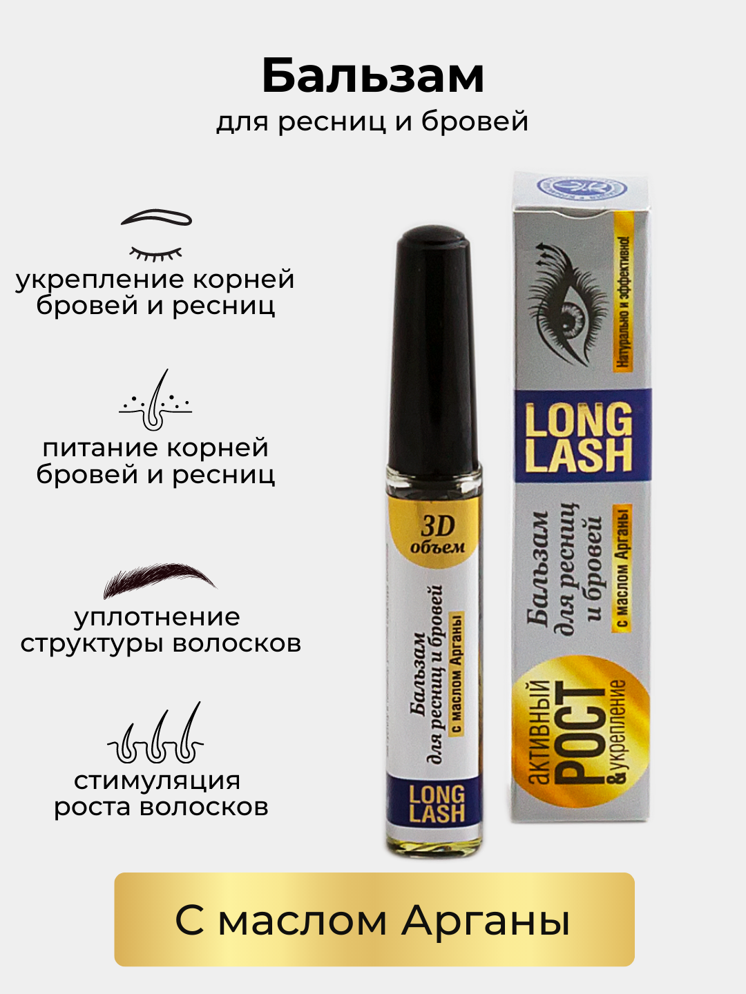 Бальзам для бровей и ресниц с маслом Арганы Активный рост и укрепление - это пышные ресницы и 3D-обьем. Действует натурально и эффективно! Бальзам питает и укрепляет корни ресниц и бровей, стимулирует их рост, улучшает внешний вид. Останавливает выпадение, оказывает защитное действие, возвращает им густоту и толщину, уплотняя структуру волосков. В составе богатый комплекс масел: оливковое, рициновое, масло виноградной косточки, масло зародышей пшеницы, масло жожоба, масло Арганы.