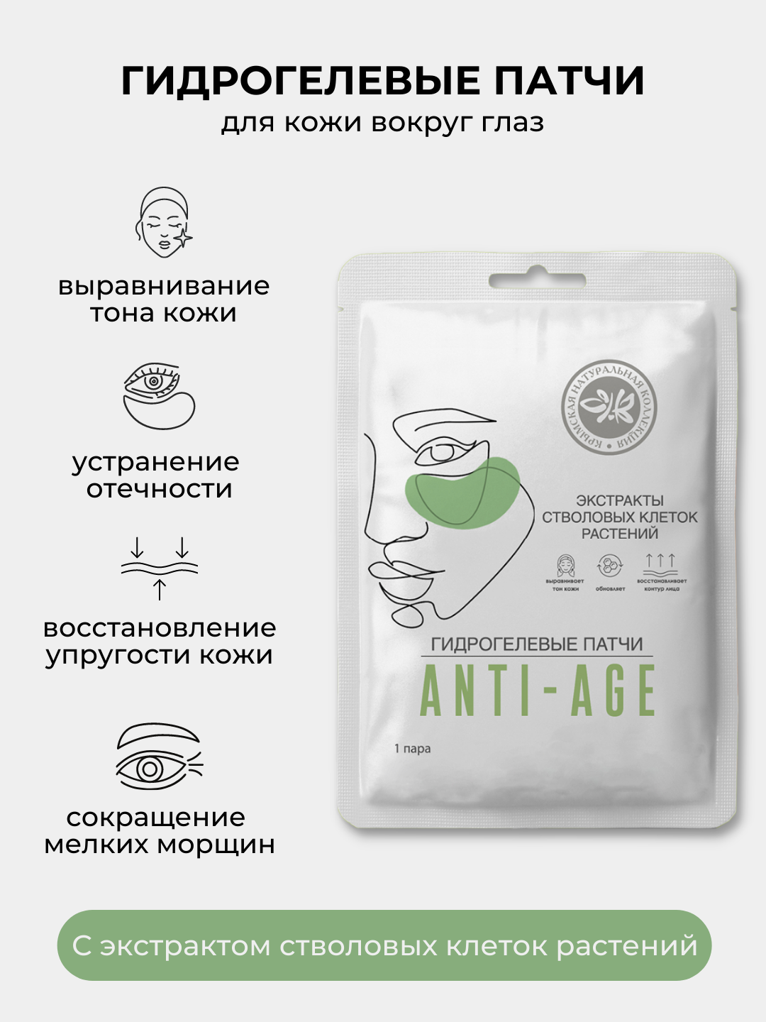 Гидрогелевые патчи ANTI-AGE созданные на основе морских водорослей выравнивает тон кожи, обновляют и восстанавливает контур лица. Представляют собой пористый и дышащий гидрогель, пропитанный сывороткой. При контакте с кожей, патчи оставляют небольшие молекулы агар-агара и каррагинана, которые сохраняют кожу увлажненной длительное время. Сыворотка обогащена экстрактами стволовых клеток растений и стимулирует процессы восстановления и обновления клеток нежной кожи век. Запускаются процессы синтеза коллагена и собственных антиоксидантов. При регулярном применении эффект накапливается, кожа под глазами разглаживается и приобретает свежий вид.