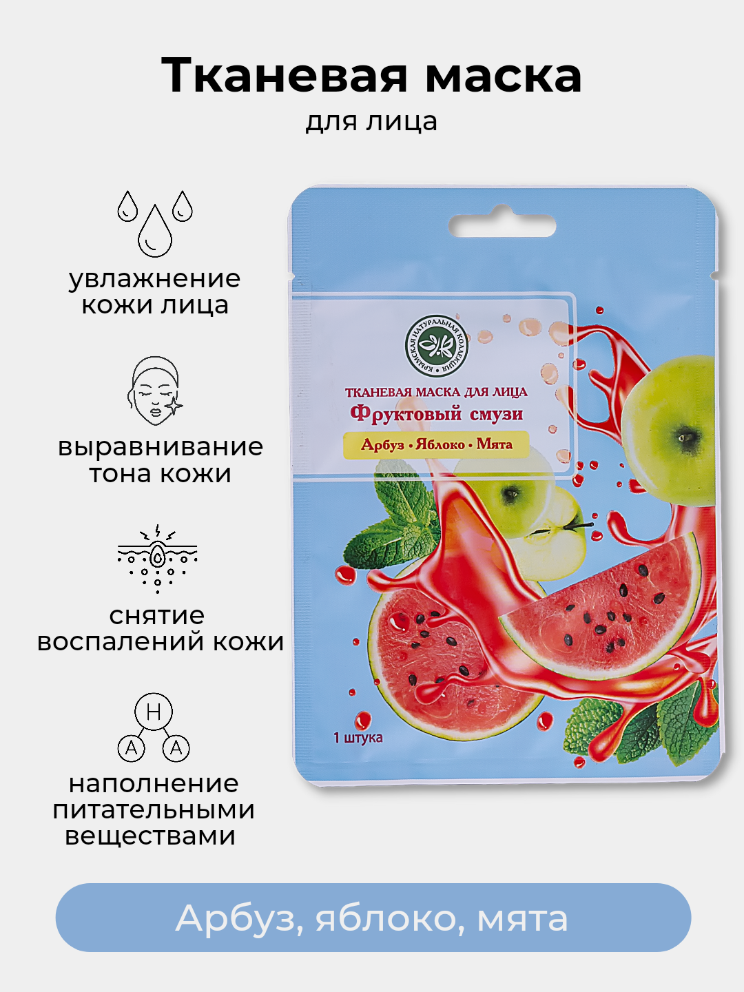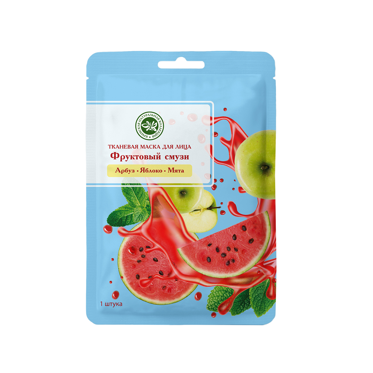 Тканевые маски SUPERFOOD - это сохранение старинных традиций ухода за кожей, полный комплекс нутриентов. Маска для лица “Арбуз, яблоко, мята” тонизирует, подтягивает, освежает и увлажняет кожу, усиливает кожный иммунитет. Неповторимый фреш из арбуза, яблока и мяты освежает и поднимает настроение. Арбуз обеспечивает защиту от негативных факторов окружающей среды, улучшает клеточное дыхание, тонизирует и увлажняет кожу. Яблоко выравнивает тон кожи, наполняет питательными веществами и смягчает. Мята освежает и расслабляет лицо, помогает снять воспаление и тонизирует кожу.