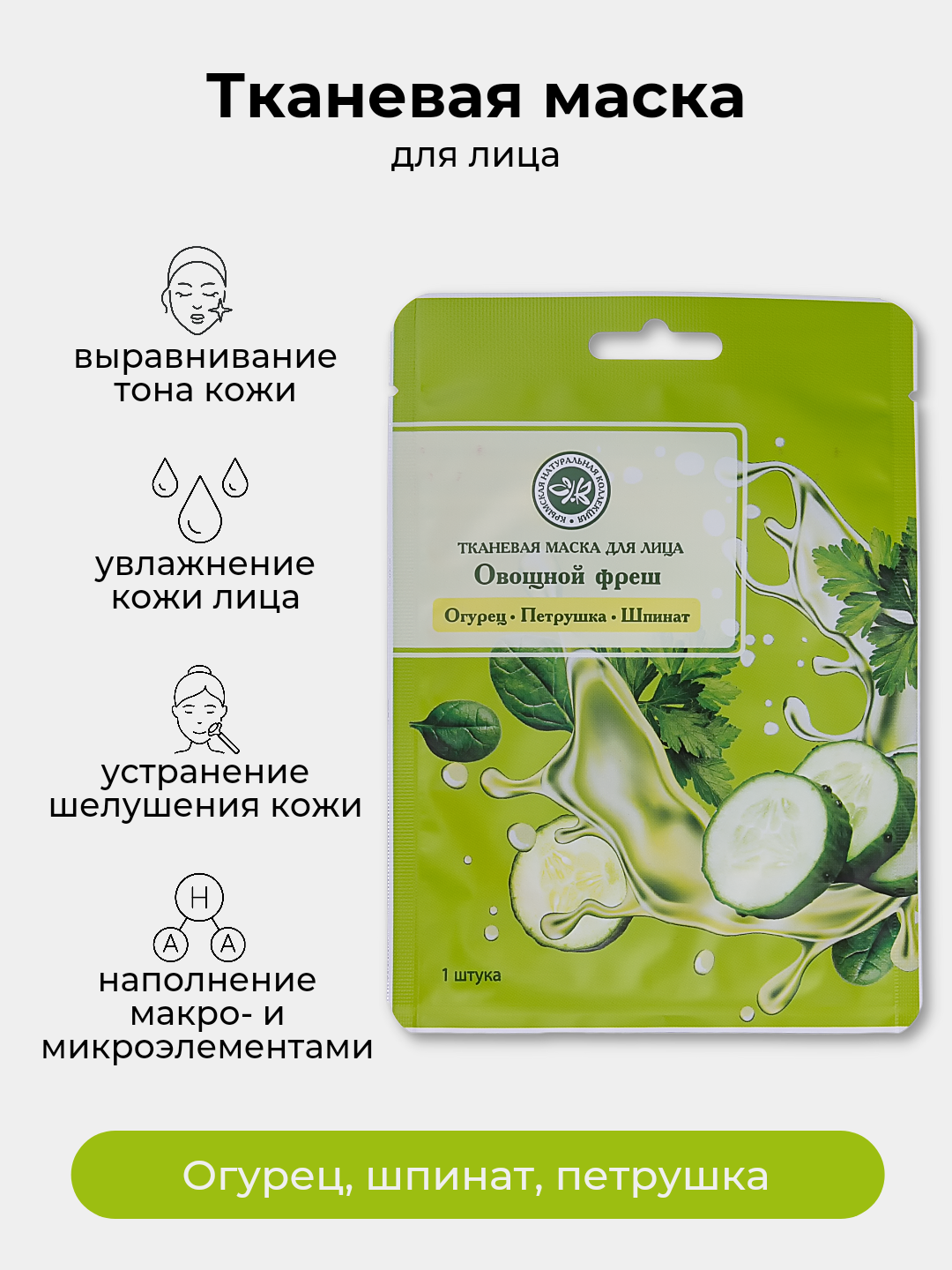 Тканевые маски SUPERFOOD - это сохранение старинных традиций ухода за кожей, полный комплекс нутриентов. Маска для лица “Огурец, Петрушка, Шпинат” выравнивает тон, укрепляет контур лица, наполняет макро- и микроэлементами. Овощной коктейль - это радость здоровья и жизни. Шпинат восстанавливает защитные силы кожи, оказывает противовоспалительное и увлажняющее действие. Петрушка выравнивает тон кожи, восстанавливает поврежденные участки, мягко отшелушивает ороговевшие чешуйки, матирует. Огурец освежает кожу, помогает укрепить овал лица, оказывает антиоксидантное действие.