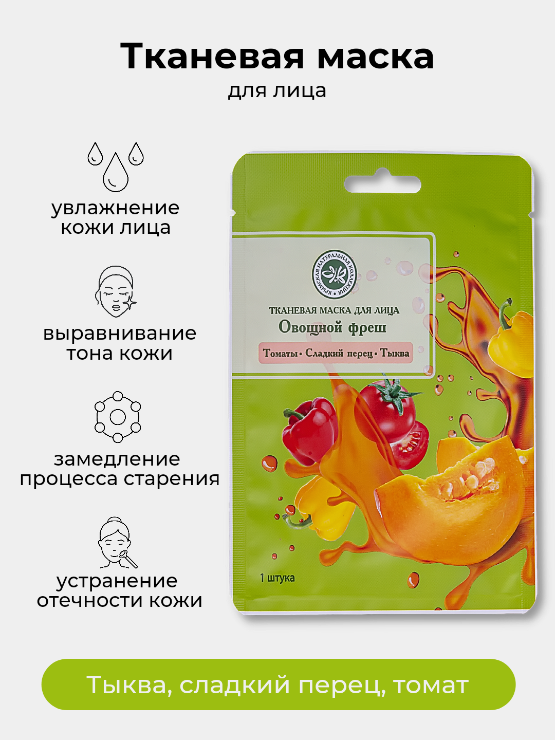 Тканевые маски SUPERFOOD - это сохранение старинных традиций ухода за кожей, полный комплекс нутриентов. Маска для лица “Тыква, сладкий перец, томат” омолаживает, питает и оказывает лимфодренажное действие. Яркость красок и сила земли сохранены в крымских овощных коктейлях. Тыква питает и увлажняет кожу, снимает раздражение и сухость кожи. Сладкий перец помогает устранить отечность, укрепить стенки сосудов, сохранить молодость. Томат делает кожу упругой и эластичной, выравнивает ее тон и рельеф.